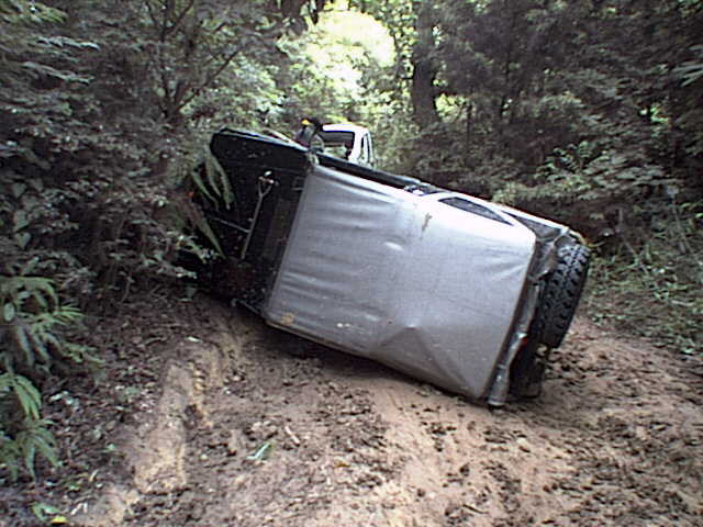 この後リカバリに失敗。斜面を斜めに降りてくる途中で限界を超え、右方向へ横転し、さらにその勢いで転がりながら斜面を降りてきた。斜面の下に着いた時にはちょうど1回転して、何事もなかったかのような体勢で停車していた。