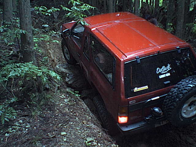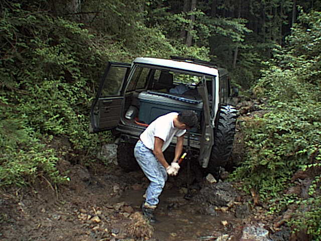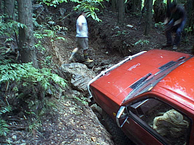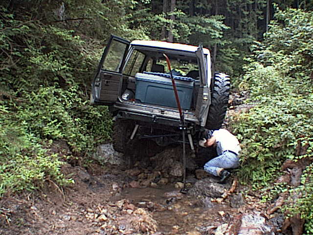 腹下に岩を抱え込んでしまったので、ハイリフトジャッキで持ち上げてタイヤの下に置き石。