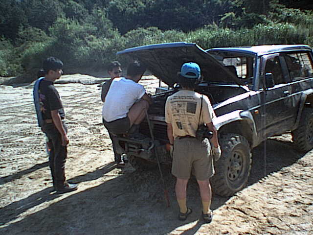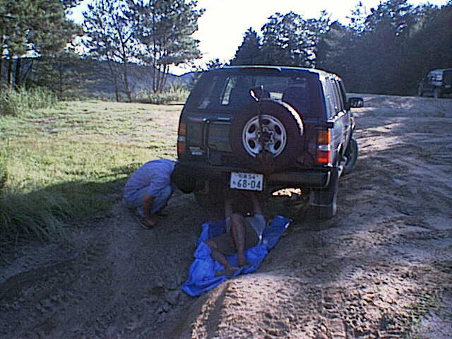 引き起こすためのウインチと、斜面下にずり下がらないようにするためのウインチを掛ける。