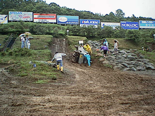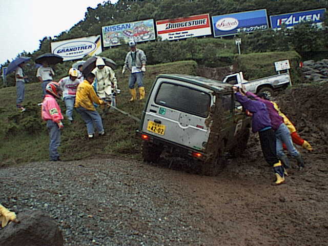 オフィシャルにエントラント,ギャラリーも加わって転倒車を起こす。結局人力で起こした方が速かったというのがジムニーらしい。