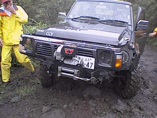 フロントグリルが立木にひっかっかって横にずれてしまった。