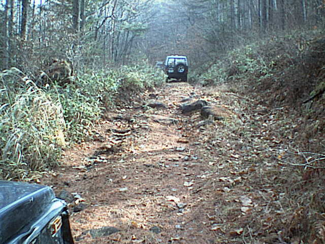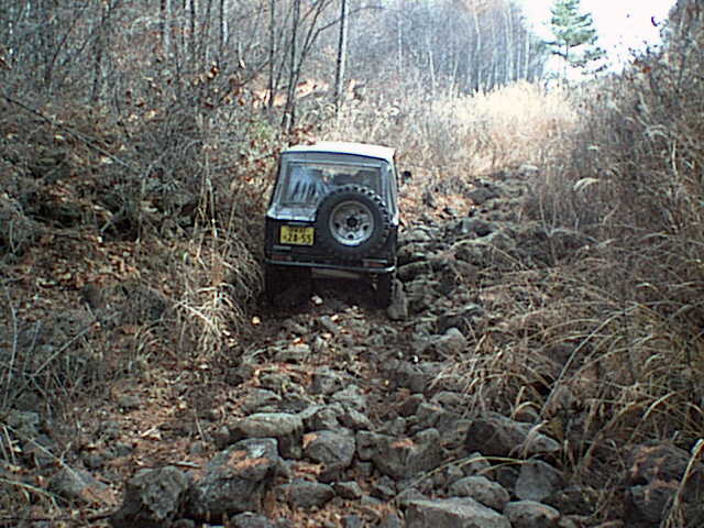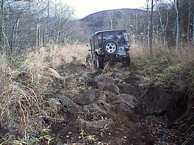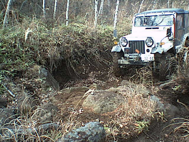先に進むとこんな段差(カーブ付き)もあります。ATタイヤでゆっくり行こうとしたら登り切れず。バックも出来ずにテールランプ破損。