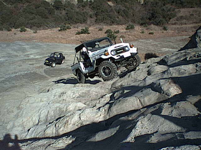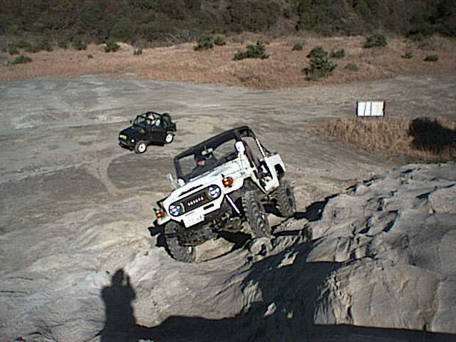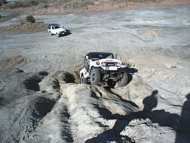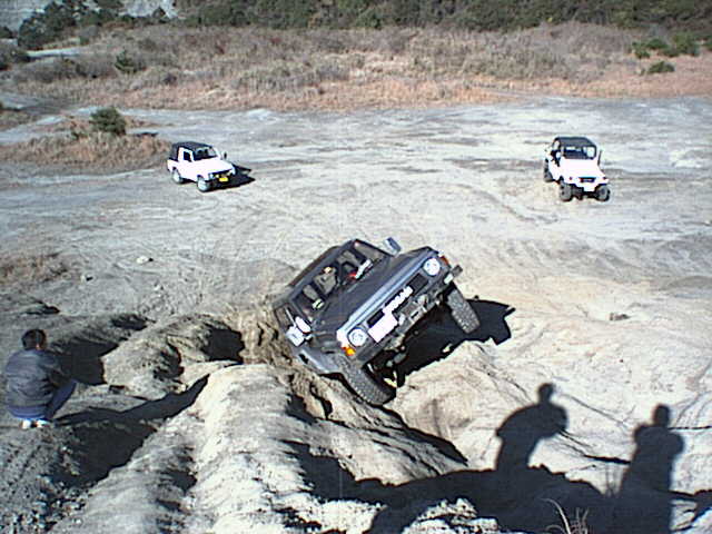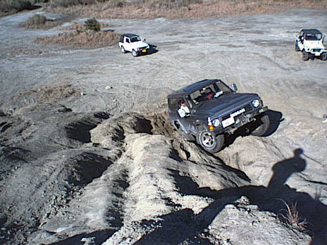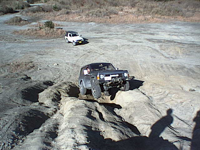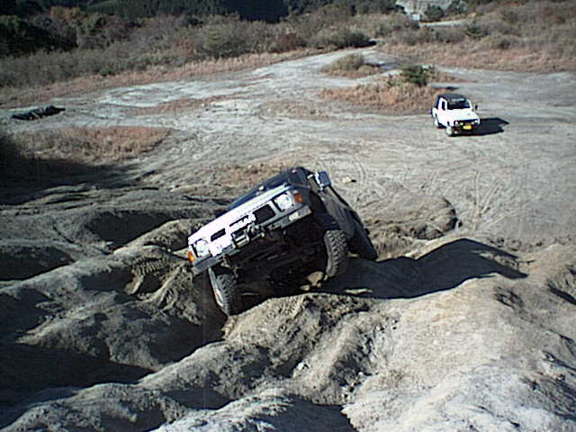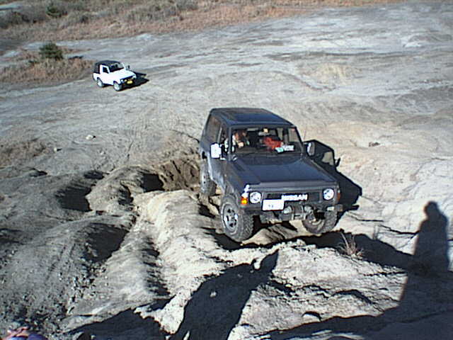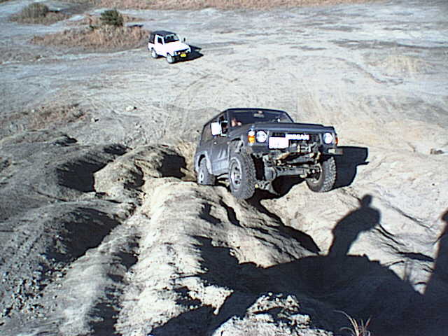 ジムニーがすっぽりはまる窪地をワイドトレッドを活かして跨ぎ上ろうとする松田さんのY60サファリ。ジムニーで同じ所に左タイヤを通すと転びます^^