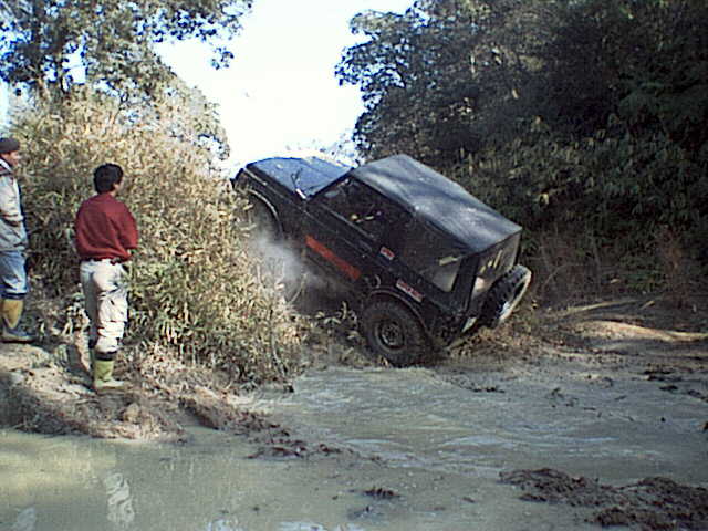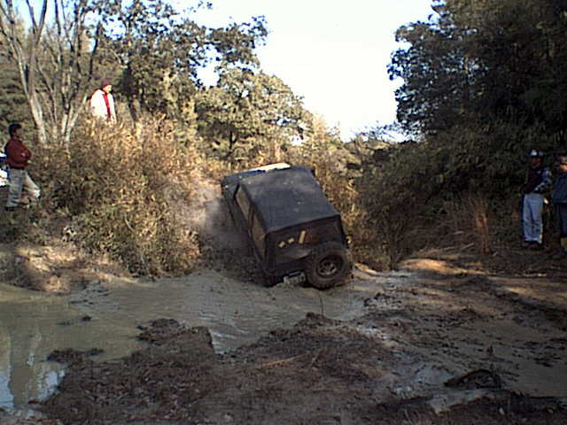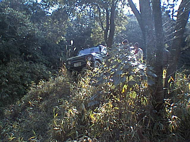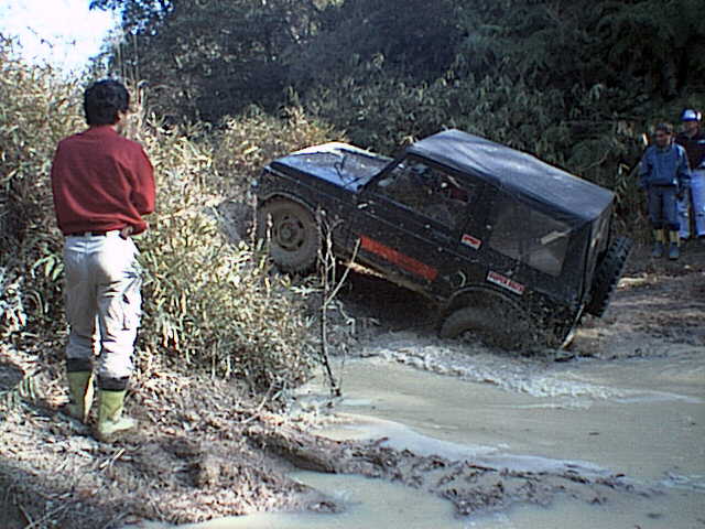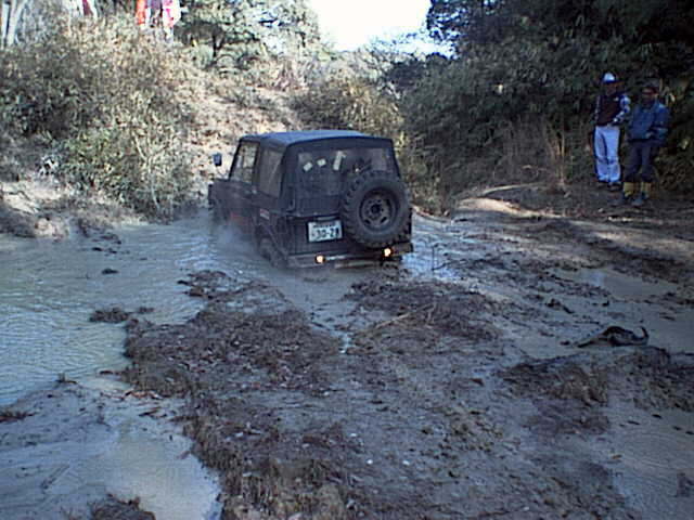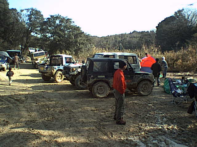 現地には忘年会2日目の昼前に到着。 周辺の各JCJ支部や、その他の人達が訪れて大にぎわい。 深い泥池からのステアケースに挑む渡会SJ40。 泥池からは出られるもののその先が辛い。 何度もアタックして惜しいところまでは行くんだけど。 泥池の中でエンジン不調に陥り、パワーが出なくなってしまった。 あえなく、ウインチ車でレスキュー。 ウインチで引き上げられた先の小山の上。