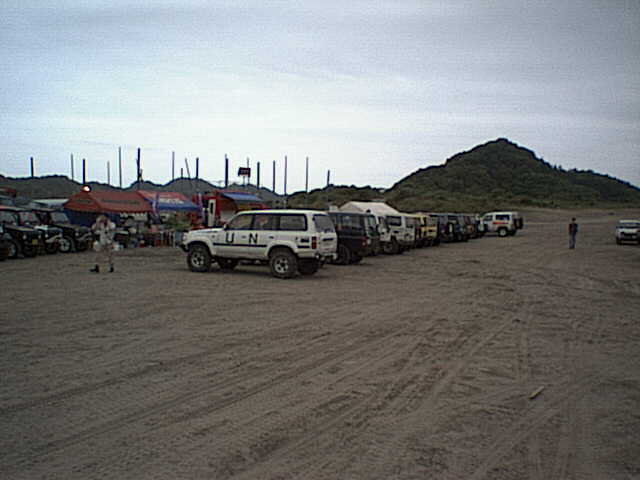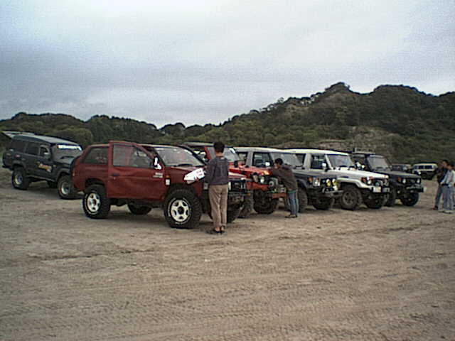 手前から、ジムニーJA11(saka)、ビッグホーンUBS25DW(みずかみ)、サファリY60(松田=Niftyserve S4WDSPでのハンドル名「サキ」)