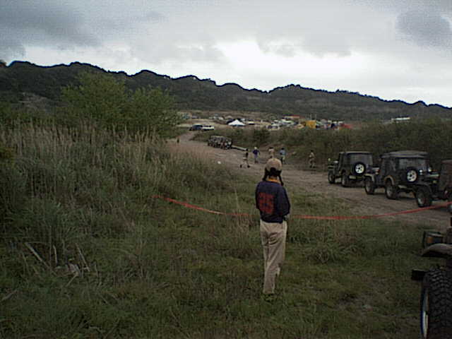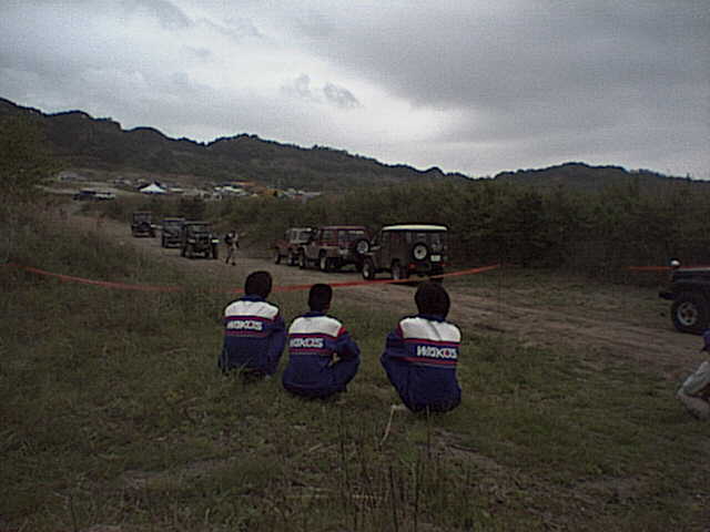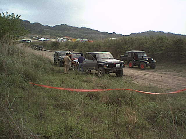 1番手のTRS(倒壊レスキューサービス)がゴールしてきた。先頭車両のオクムラさん(これまたNiftyでの友人)は、ミスコースのにタイムロスをしたらしい。2又の部分にコーステープが張って無かったのでF2に初めて来た彼にはコース図だけでは判らないのも仕方がない。