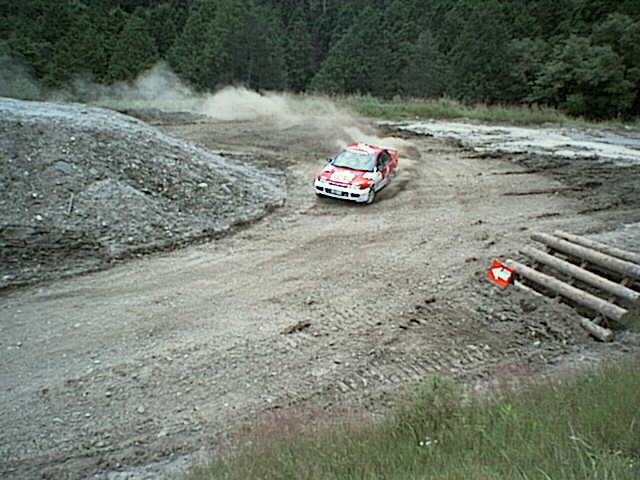 向こうでは、小林@テラノがV字溝から上がってくるが、この時マフラーの継ぎ目を破損してしまった。