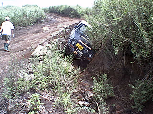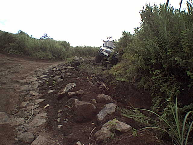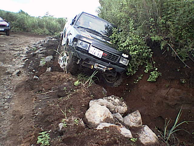 前輪が岩を越えられず、後輪は堀下がっていく。