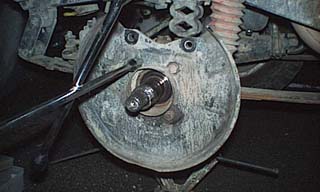ブレーキキャリパーの裏のボルトを2本外して、ブレーキキャリパーをディスクから外します。