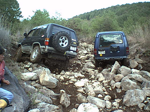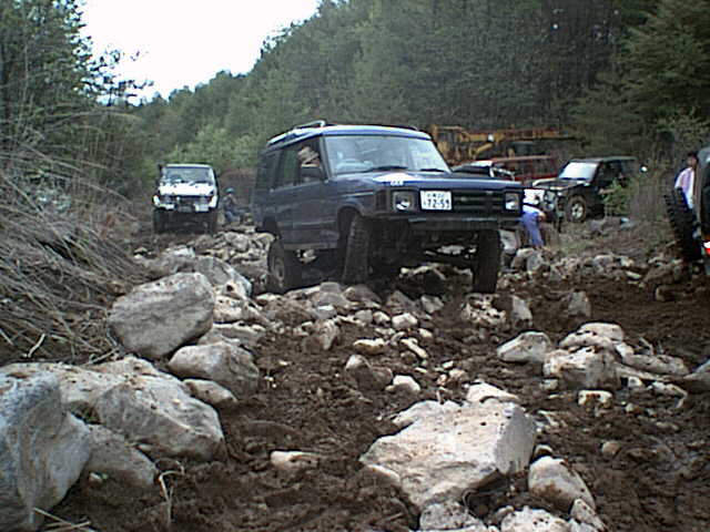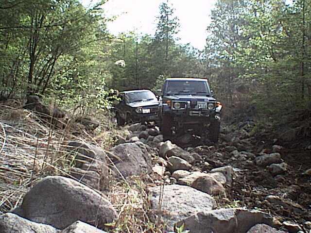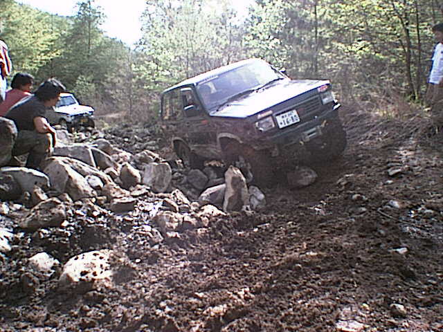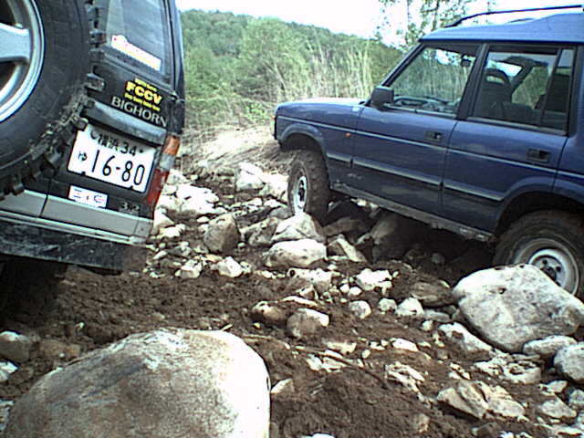 「蟻地獄」を抜けるとガレ場に出る。 やっぱり大岩も腹下に干渉せずにまたいでいく。 しかし、調子に乗ると岩を抱えます。DISCOと仲良くスタック中。 のどかな午後。寄り添う2台。 DISCOの腹下にはこんな岩が。 脱出完了。